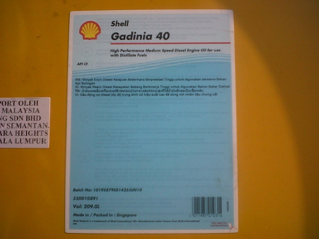 Shell Gadinia 40 Shell Gadinia Oils are premium quality diesel engine lubricants, based on highly-refined mineral oils and carefully selected additives. They are specially designed for main propulsion and auxiliary marine trunk piston engines burning distillate fuel. Applications Highly-rated, medium speed, trunk-piston marine engines Auxiliary marine engines Geared transmissions Turbochargers Variable pitch propellers Oil lubricated stern tubes Deck machinery Other applications requiring an SAE 30 or 40 viscosity oil Performance FeaturesA marine engine lubricant has to perform satisfactorily under conditions that are more arduous than those encountered in transportation applications. Of particular importance is the higher sulphur content of marine distillate fuels and the possibility of water contamination, especially sea water. In addition, the oil may be expected to remain in service for long periods before it is changed.Consequently, Shell Gadinia Oils are designed to effectively neutralise the corrosive acids contained in the products of combustion of marine distillate fuels, to give adequate protection against corrosion and rusting and to readily shed water and soot in a lubricating oil purifier. At the same time, the use of Shell Gadinia Oils will ensure a clean engine, free from sludge and deposit formation.Performance SpecificationsAPI Classification - CDUS Military - MIL-L-2104C (obs)Shell Gadinia Oils are approved by most leading trunk piston diesel engine manufacturers.Seal CompatibilityShell Gadinia Oils are compatible with all normal oil seal materials.PurificationNormal purification equipment and practices for heavy duty crankcase lubricants should be used to ensure that Shell Gadinia Oil does not become over burdened with solid contaminants and water. With centrifugal purification, "water-washing" to remove strong acids is unnecessary.AvailabilityShell Gadinia Oils are available in SAE 30 & 40 Viscosity grades.Health & SafetyShell Gadinia Oils are unlikely to present any significant health or safety hazard when properly used in the recommended application, and good standards of industrial and personal hygiene are maintained.Avoid contact with skin. Use impervious gloves with used oil. After skin contact, wash immediately with soap and water.For further guidance on Product Health & Safety refer to the appropriate Shell Product Safety Data Sheet.Protect the environmentTake used oil to an authorised collection point. Do not discharge into drains, soil or water.AdviceAdvice on applications not covered in this leaflet may be obtained from your Shell Representative.