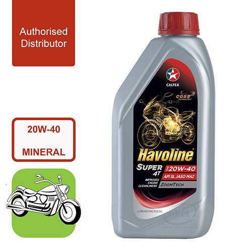 Havoline®Super 4T SAE 20W-40 is a mineral oil that comes with Havoline C.O.R.E. Technology lubricates, protects, and cleans as you ride.