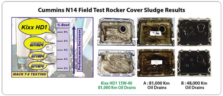 • Kixx HD1 protects sludge formed by sulfur and fuel combustion without the need for overly shortened drain intervals.