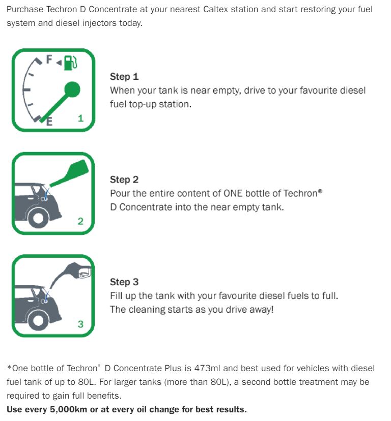 With its Precision CleanTM technology, Techron D Concentrate removes natural build-up of carbon deposits throughout the entire fuel system and internal diesel injector deposits across a range of injector technologies.